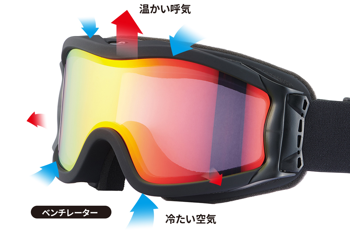 ゴーグルの上部と下部にある空気の通り穴「ベンチレーター」によって外気を効率よく取り込み、ゴーグル内部の暖かく湿った空気を排出しすることで曇りを軽減しています。