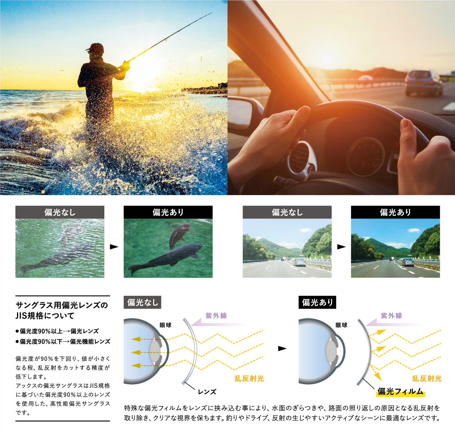 偏光レンズとは、紫外線をカットするUVカット仕様のサングラスと違い日差しの強い日の路面からの照り返しやフロントガラスなどの反射光をカットし、まぶしさを軽減するレンズです。